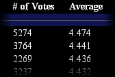 Since 1999, Filmtracks viewers have had the ability to rate their favorite scores midway down many review pages on the site. Now, as part of the May Theme of the Month in 2001, the 2-year-old ratings system has been overhauled and greatly expanded. The mass listings of the ratings have been separated into four categories: Modern Film Scores (1988 to Present), Classic Film Scores (Before 1988), Television Scores, Compilations/Other. The listings pages have all been arranged so that they are easier to read, and now include the number of votes submitted per score. Depending on the popularity of the score, the number of total votes ranges from 20 to 20,000. Finally, Filmtracks has added voting capabilities to over 300 more scores at the site, and every new review from here on will include them.